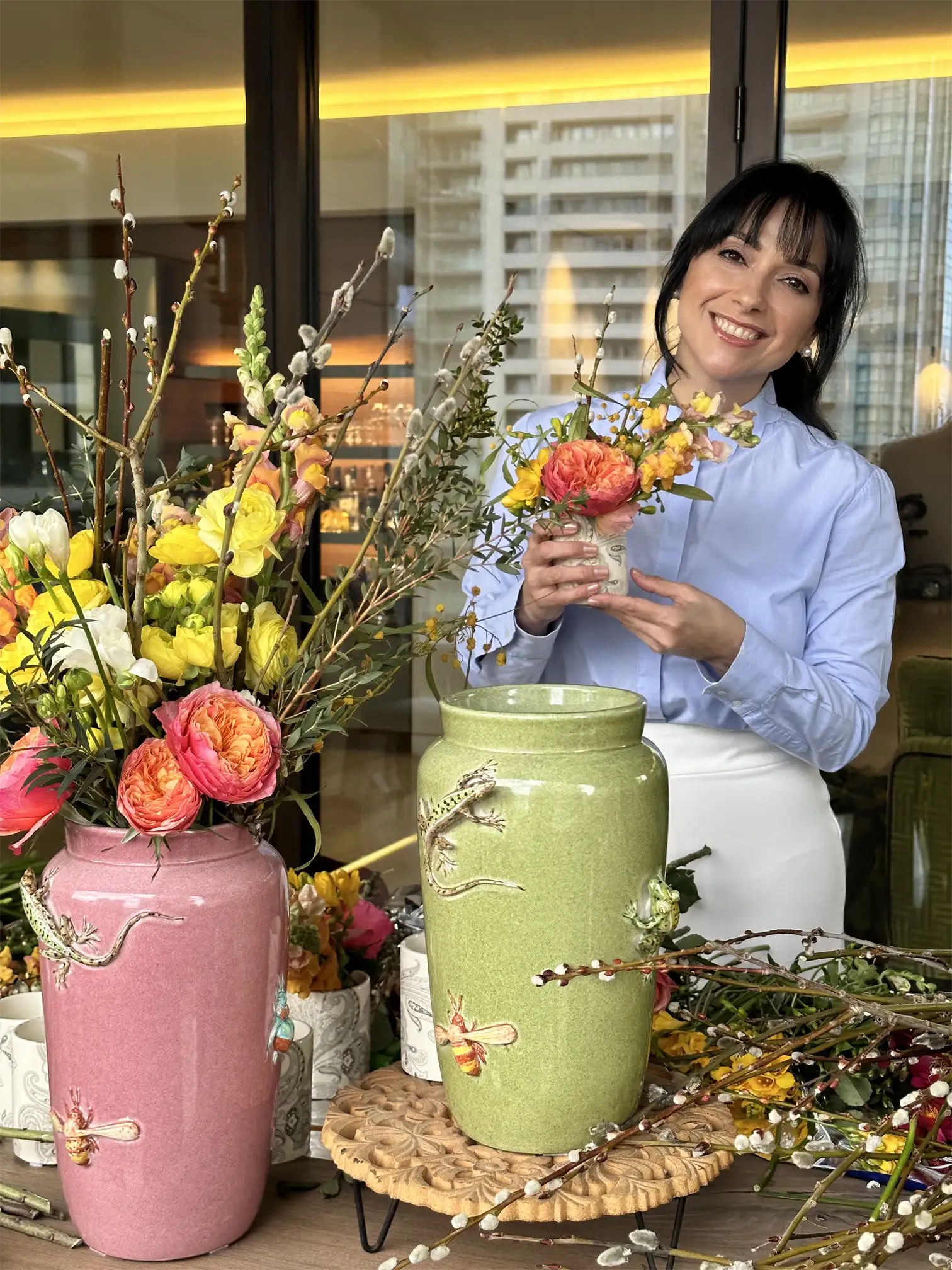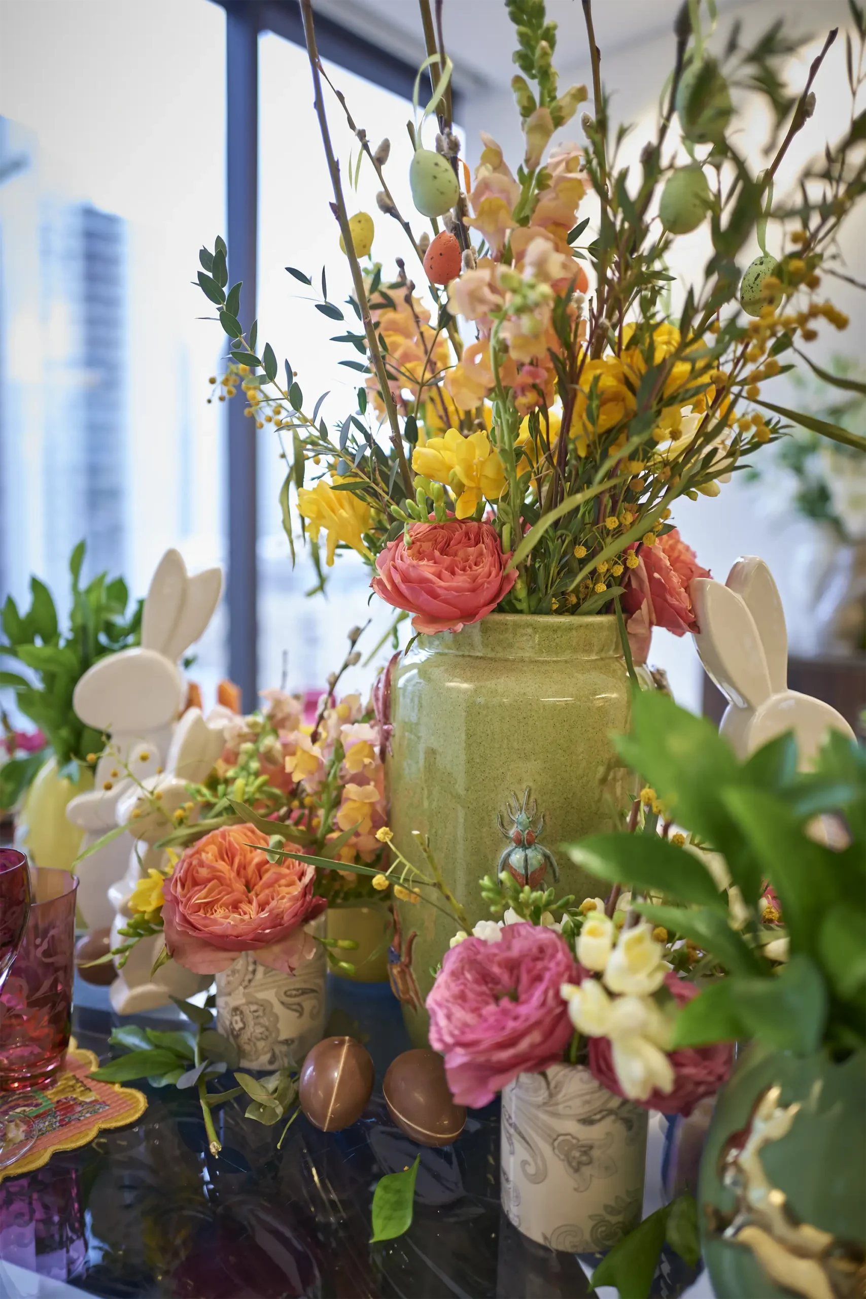 The flowers that we choose from AD FLOWERS were perfect for this occasion, I picked color shades in orange, pink, yellow, some green, and branches that I also used to hang some decorative eggs on. I chose two sizes of vases, from