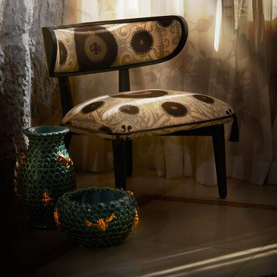 This armchair is described by its sophisticated charm, generated by the calibrated mingling of soft shades of the fabrics and the dark-colored wood. SHAH gave the space vibration of lights and zen spirit.