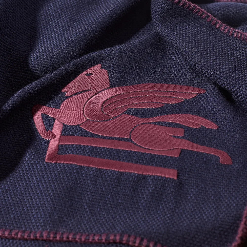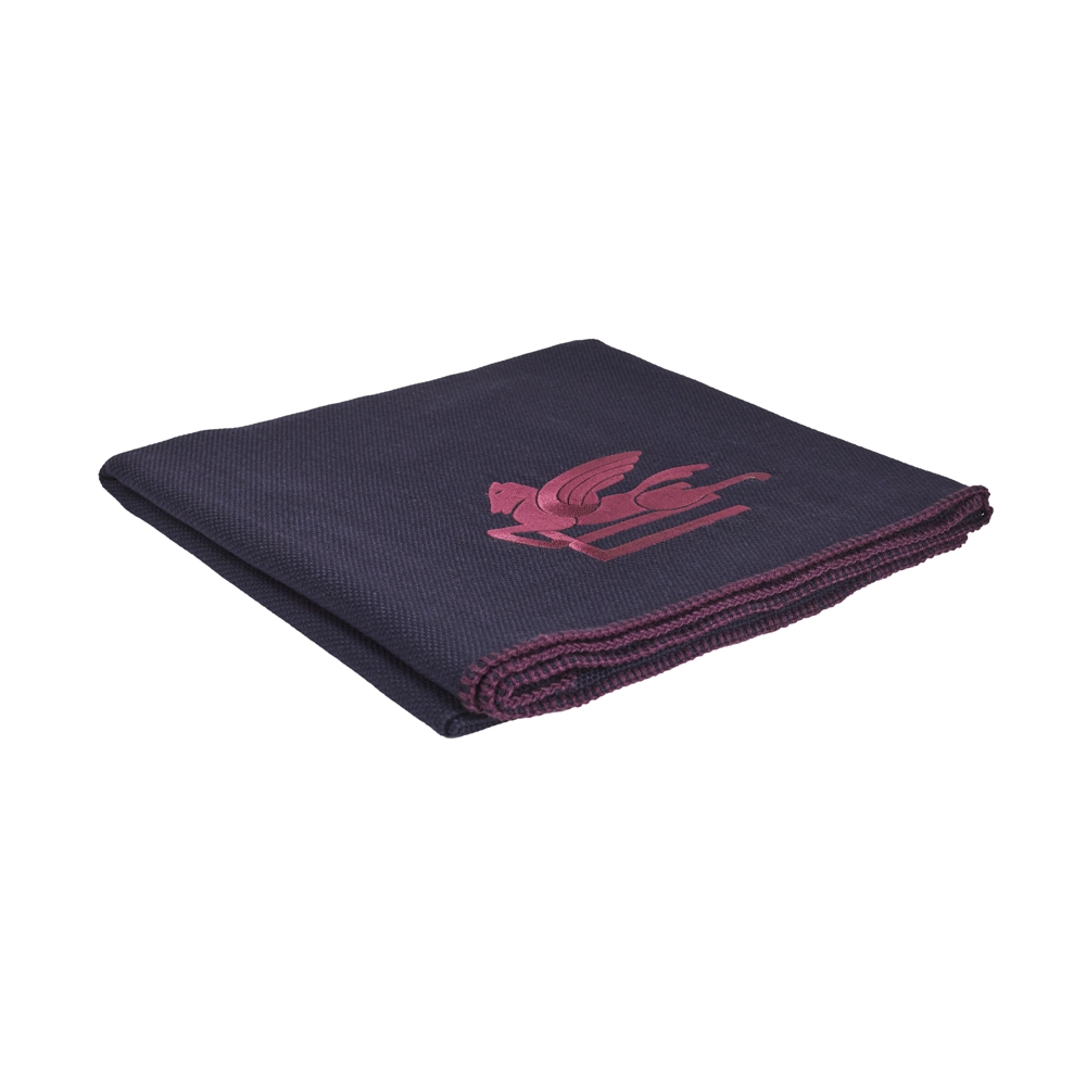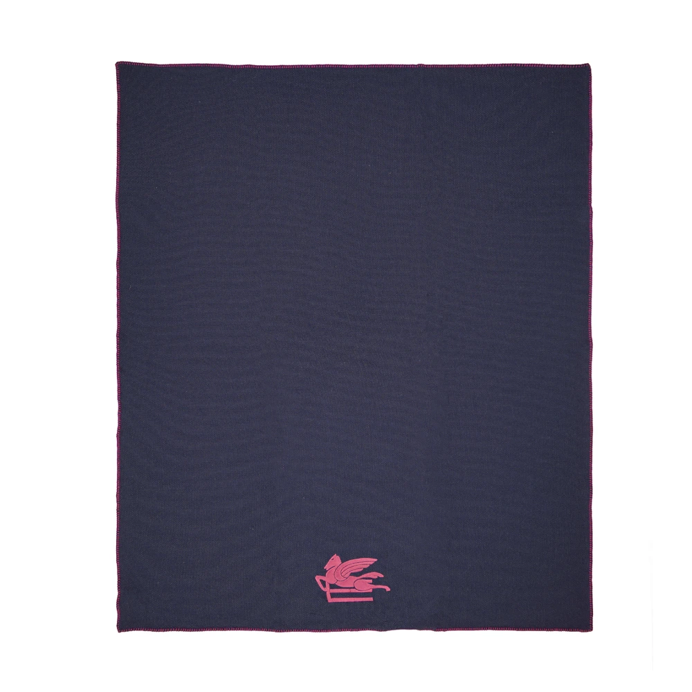 Wool throw blanket with contrasting embroidered Pegaso symbol and blanket-stitches finishing.