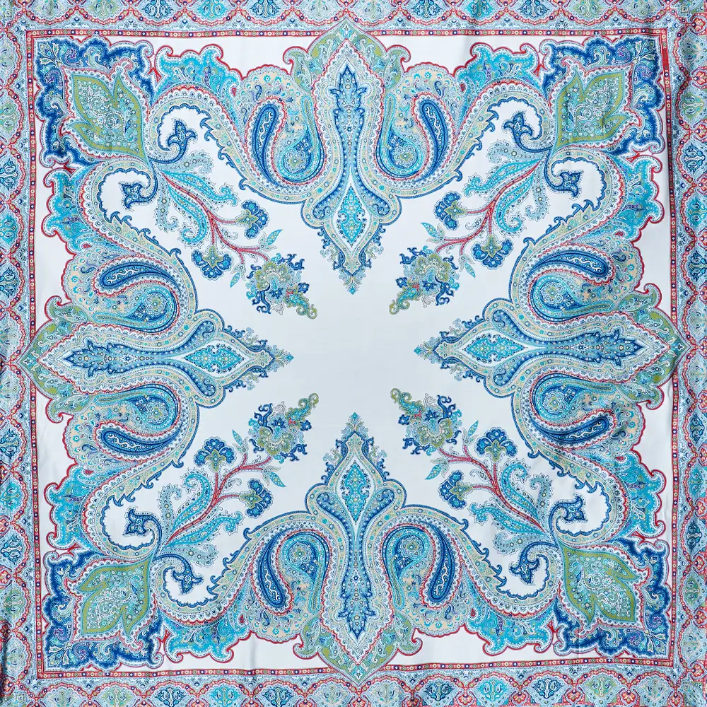 Reversible beach towel featuring a satin insert with oriental patterns and a unique paisley design. Block color toweling back embellished by the ETRO logo with Pegasus.
