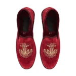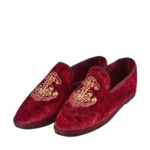 Bask in the comfort and effortless style of these beautiful pair of Chari Smoking Slippers. from ETRO . Constructed in red brocade velvet, these shoes are further made special with black quilted satin lining. Get the ultimate luxurious feel along with the sleek black leather trimming to complete the look. Lounge in style with ETRO ‘s smoking slippers.