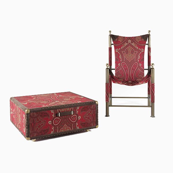 Corinto features the figure of Pegasus, historical symbol of the brand, is the unexpected protagonist of this sofa. The carved head and wings of the horse with patinated dark wengé finish are inserted in the front and lateral part of the sofa, creating an unconventional and charming dialogue with the fabric and leather of the upholstery, in a powerful red tone, in line with the institutional identity of the brand.
