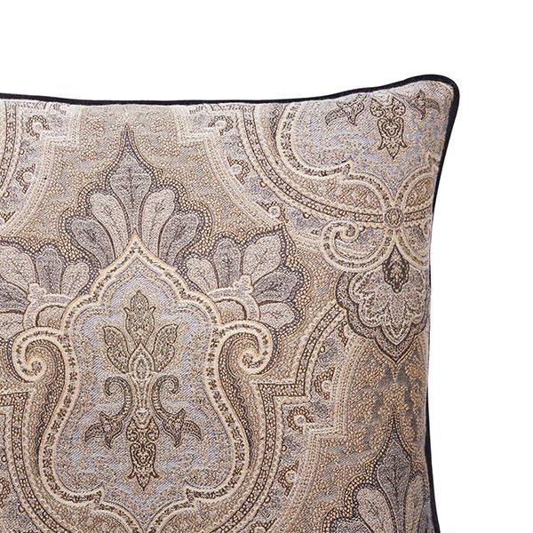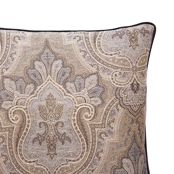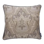 This beige paisley printed square cushion will add a splash of color to your bedroom or living space with its special designs and its black velvet piped edges.