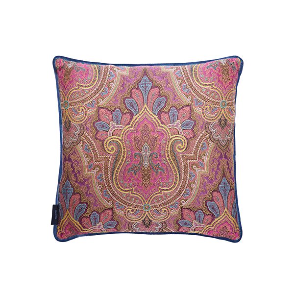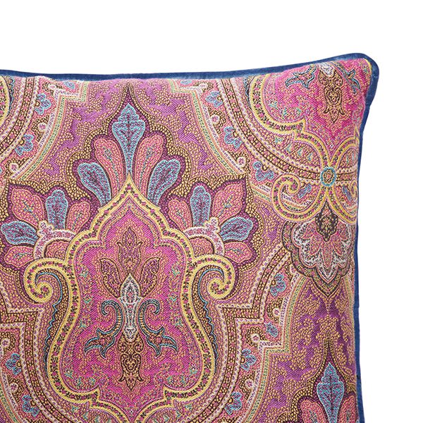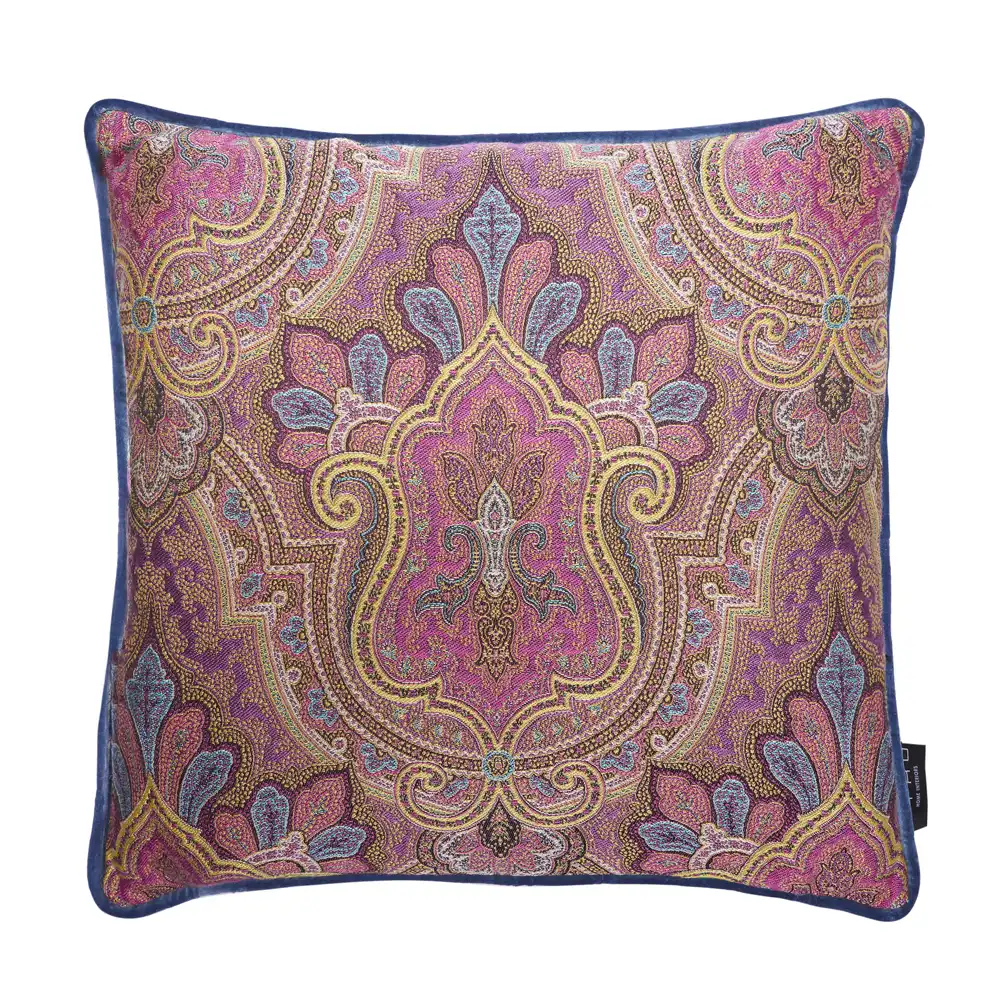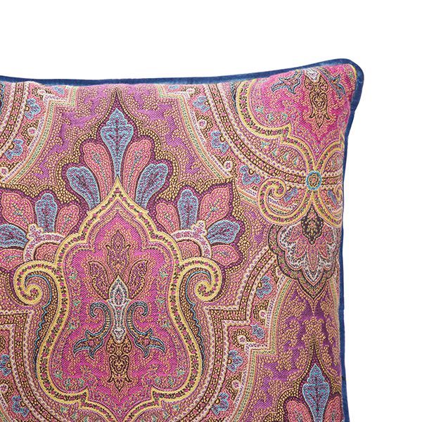 This colored paisley printed square cushion will add a splash of color to your bedroom or living space with its special designs and its cardinal velvet piped edges.