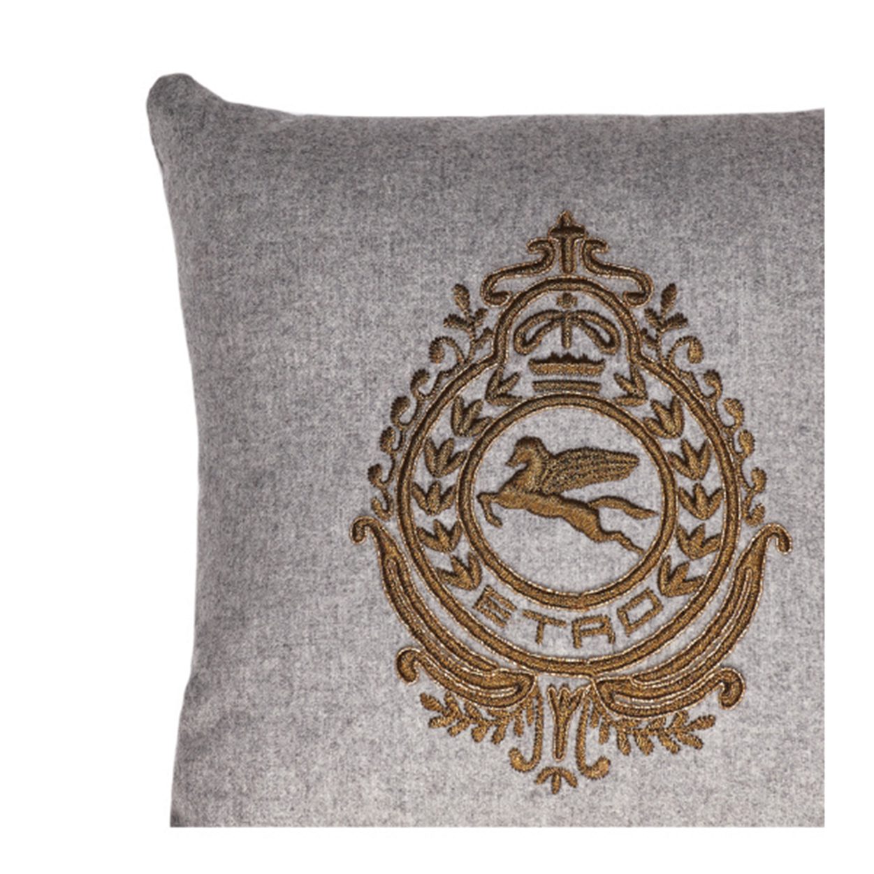 Embroidered dark gray cushion from ETRO HOME exudes timeless glamour with its textile Lenin and silk and cotton background, cushion embellished by an embroidered heraldic Pegasus and ETRO logo. Rich with bronze thread, that exudes a timeless glamour. The cushion from ETRO HOME Accessories adds an elegant touch to your living room or bedroom. Whether you use it as a trendy fashion statement accessory or a sartorial accessory, it’ll add an elegant ambiance to your home.