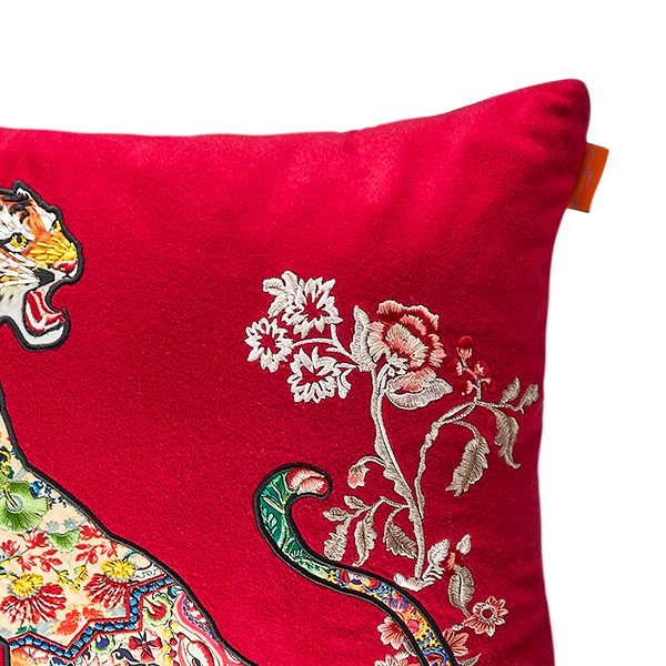 Indian inspiration for the soft cushion in woollen cloth decorated with the embroidery of a tiger and a floral decoration. Perfect for adding a special touch to beds and sofas.