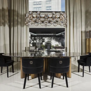 Sober and elegant forms for the Klee dining table by ETRO Home. The “E” shaped base, referred to the initial letter of the Etro logo, is made of painted bronze metal with details in Bordeaux color, while the top is realized in Carbalho veneered dyed dark wenge .