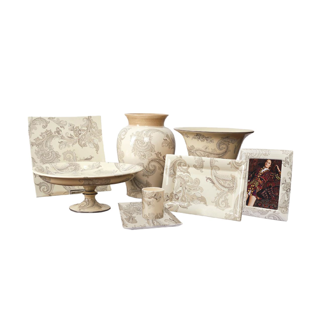 A contemporary tone on tone ivory design featuring a stylized ETRO monogram graces the borders of this ceramic photo frame. Stylish and substantial, the subtle design will enhance treasured memories.
