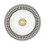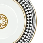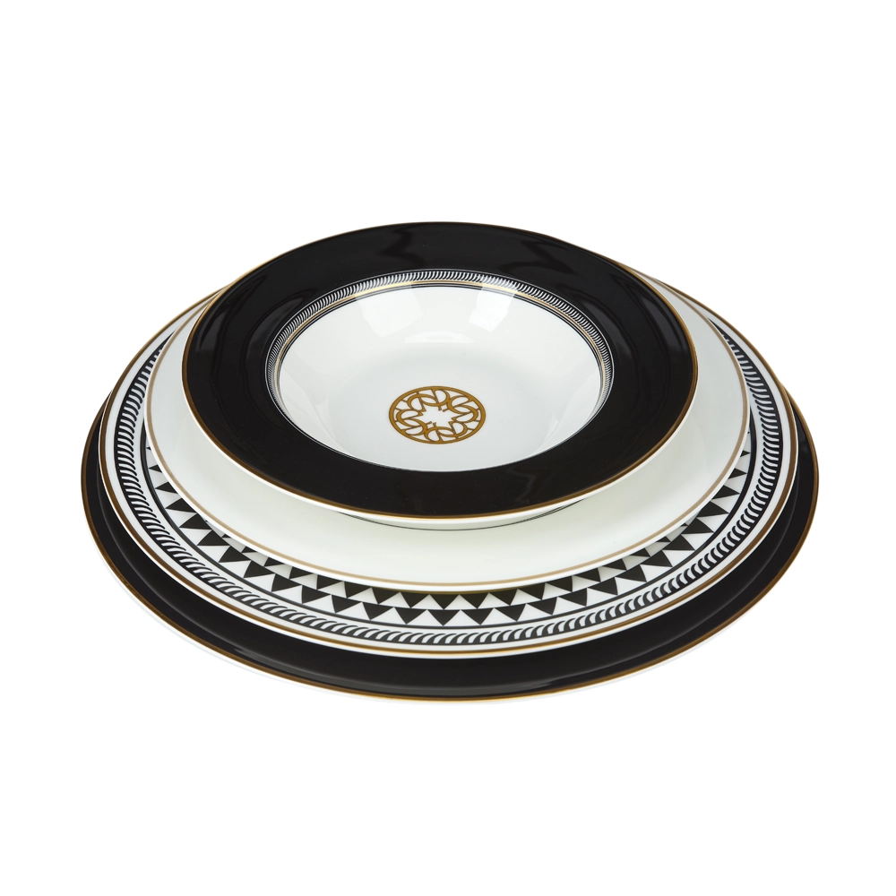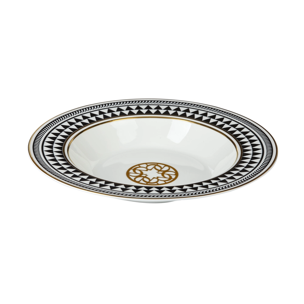 This deep round platter features intricate black & white geometric designs encircled by a gold accent, creating a perfect blend of elegance and functionality for any occasion.