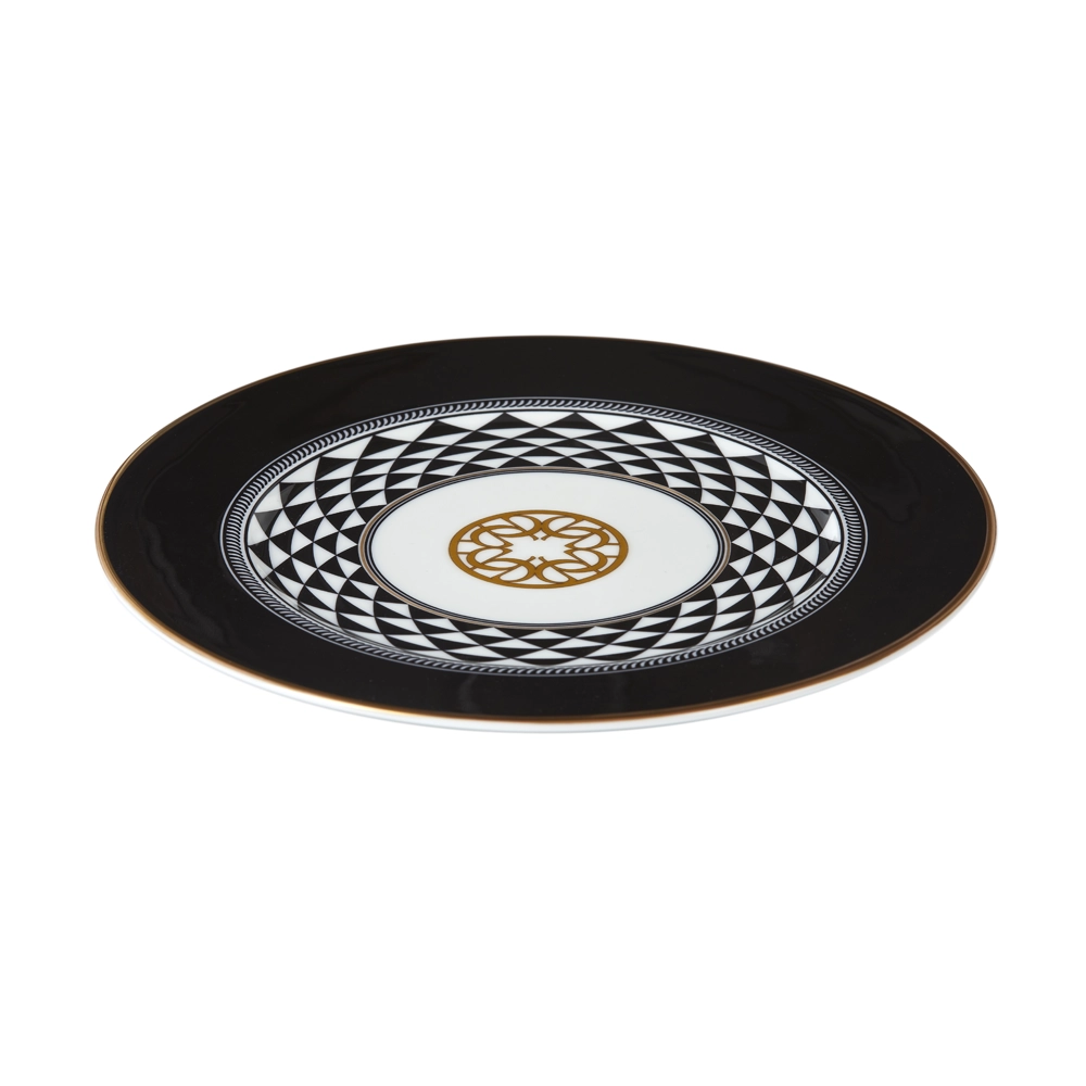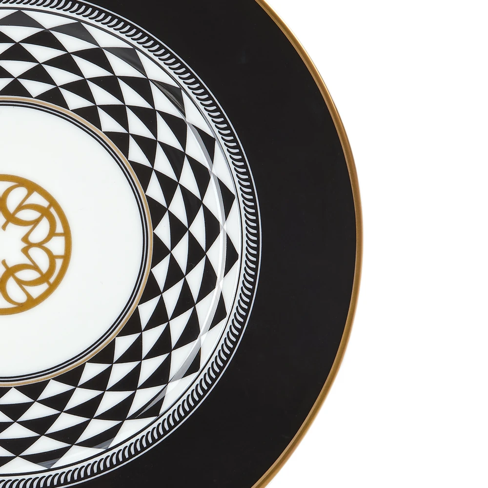 This desert & salad plate features a bold black rim paired with intricate geometric patterns in the center accented with gold, offering a striking and elegant design for any occasion.