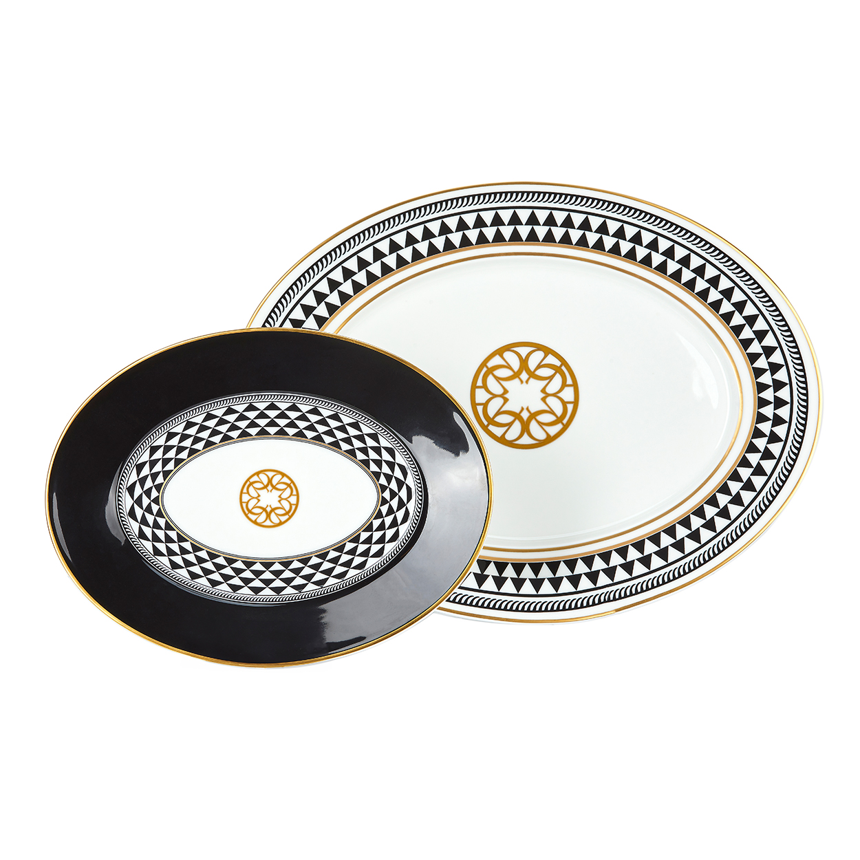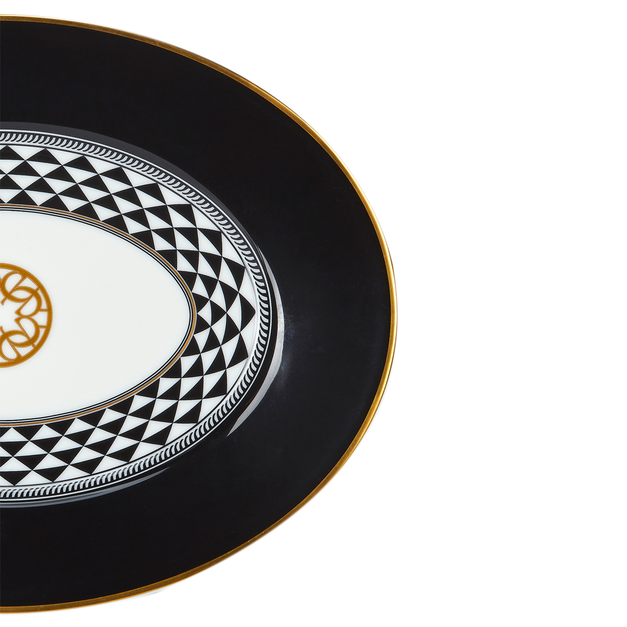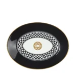 This pickle dish oval platter features a bold black border with intricate geometric patterns and gold accents, offering a stylish and elegant presentation to your table.