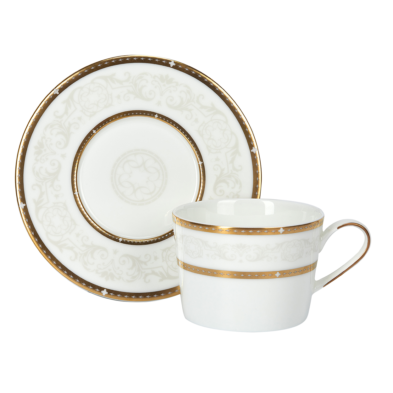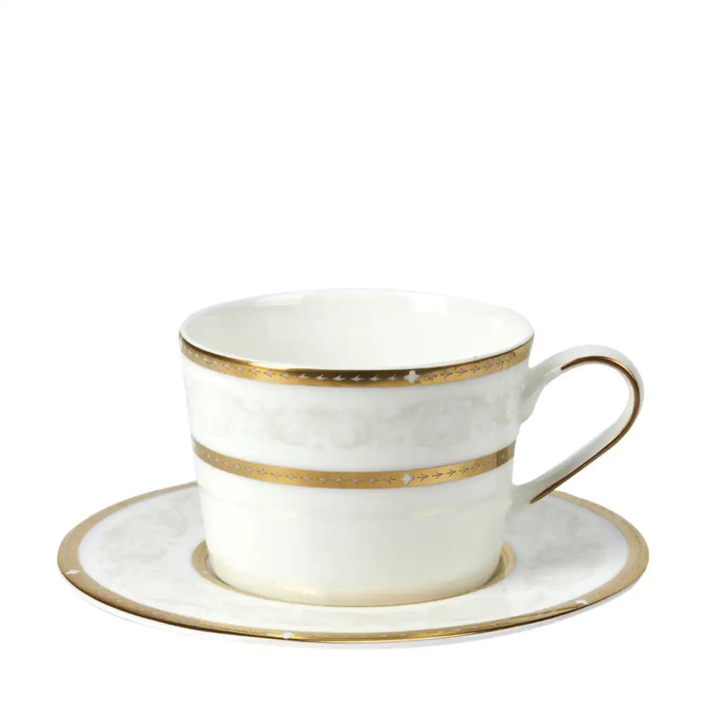 This tea cup & saucer set exudes timeless elegance, featuring fine bone China with baroque inspired gold accents.