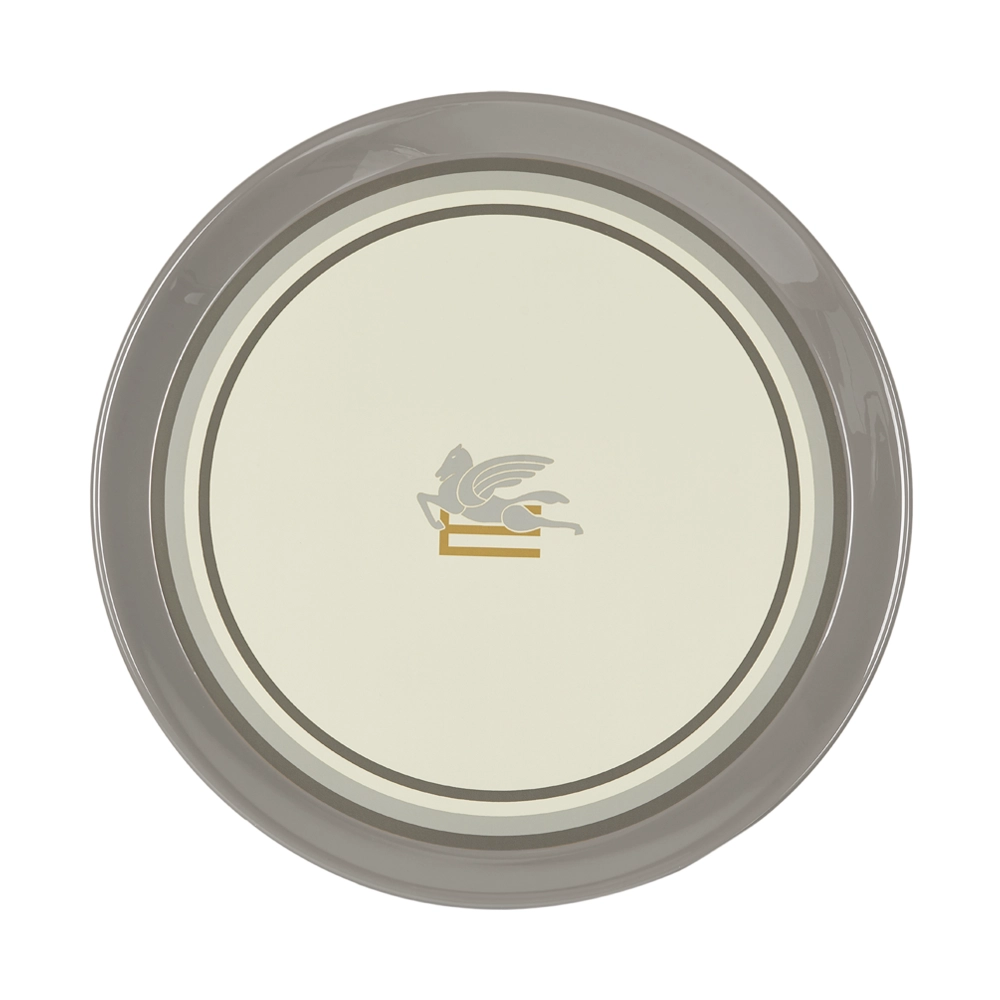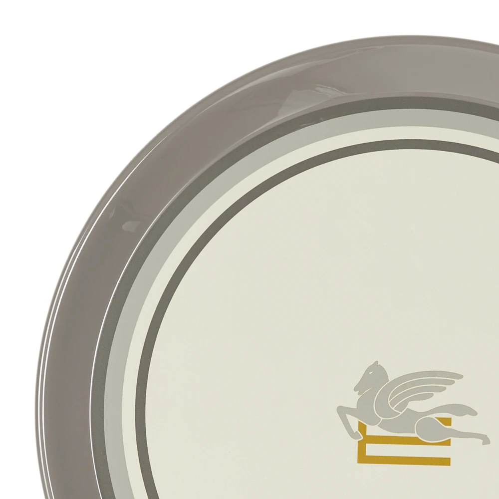 Introducing the PEGASO METAL TRAY from ETRO Home, where sophistication meets functionality in an exquisite display of design. Available in refined grey, elegant pink, and refreshing green, each tray boasts a captivating geometrical painting that adds a touch of contemporary flair to your space. Accentuated by the iconic ETRO logo in lavish gold at its center, this tray stands as a symbol of luxury and refinement. Supported by a sleek metal stand, this tray embodies a perfect harmony of form and function.