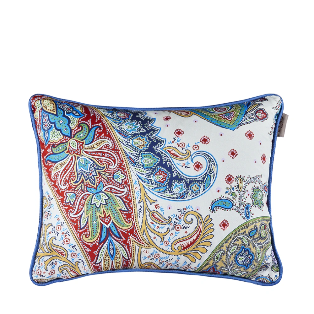 Pernem cushion from ETRO. was designed with a symbolic multicolored paisley pattern hue on an ivory background. This combination elevates your interior’s mood and adds a phenomenal style with its various evocative shapes. This cushion is symbolized with a paisley print on the front side and a solid blue colored hue on the backside. Elevate your interior space with this modern cushion from ETRO.