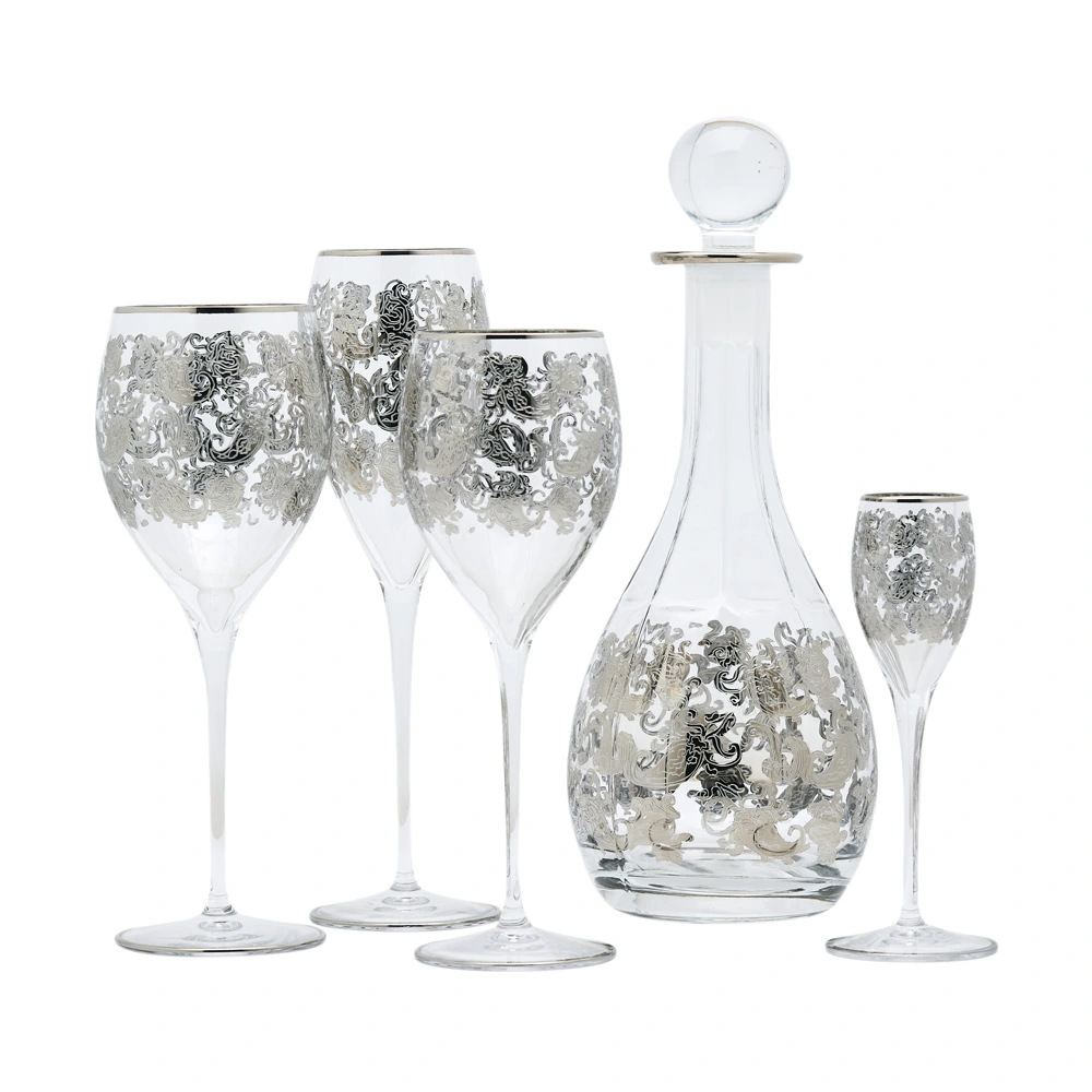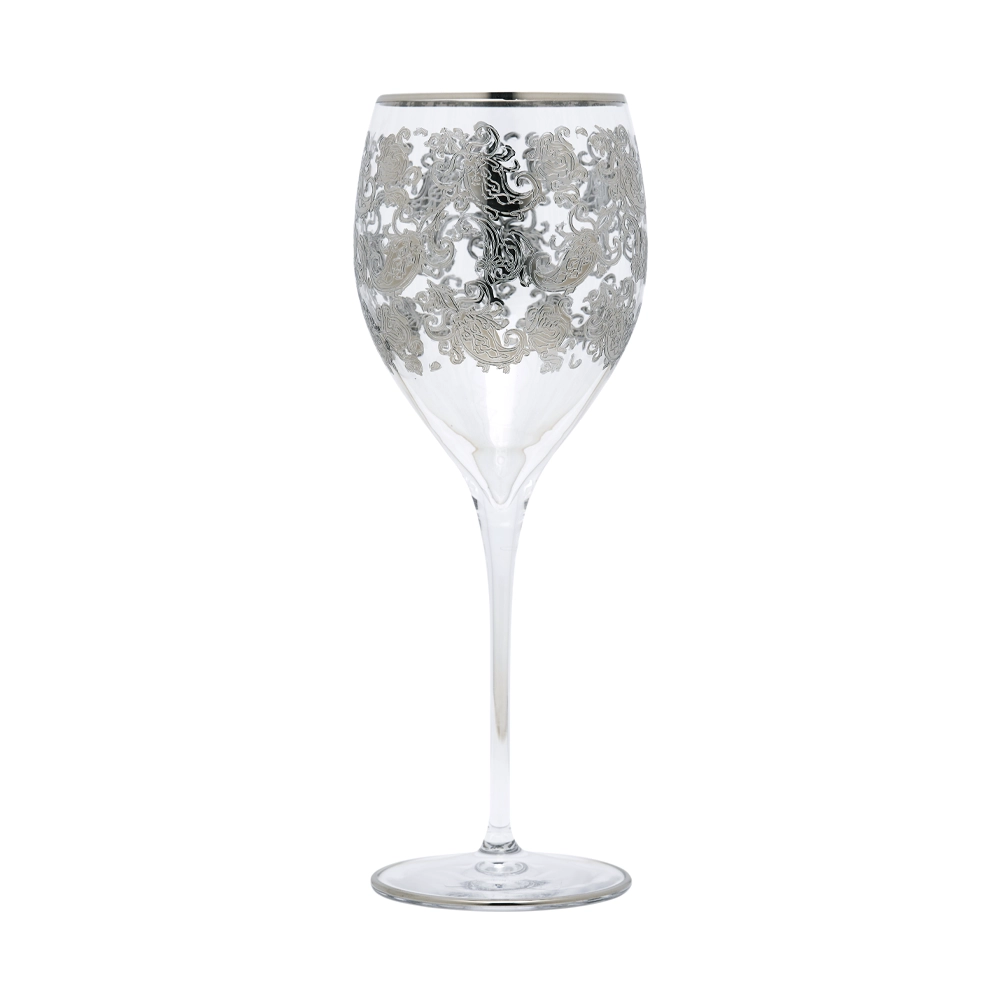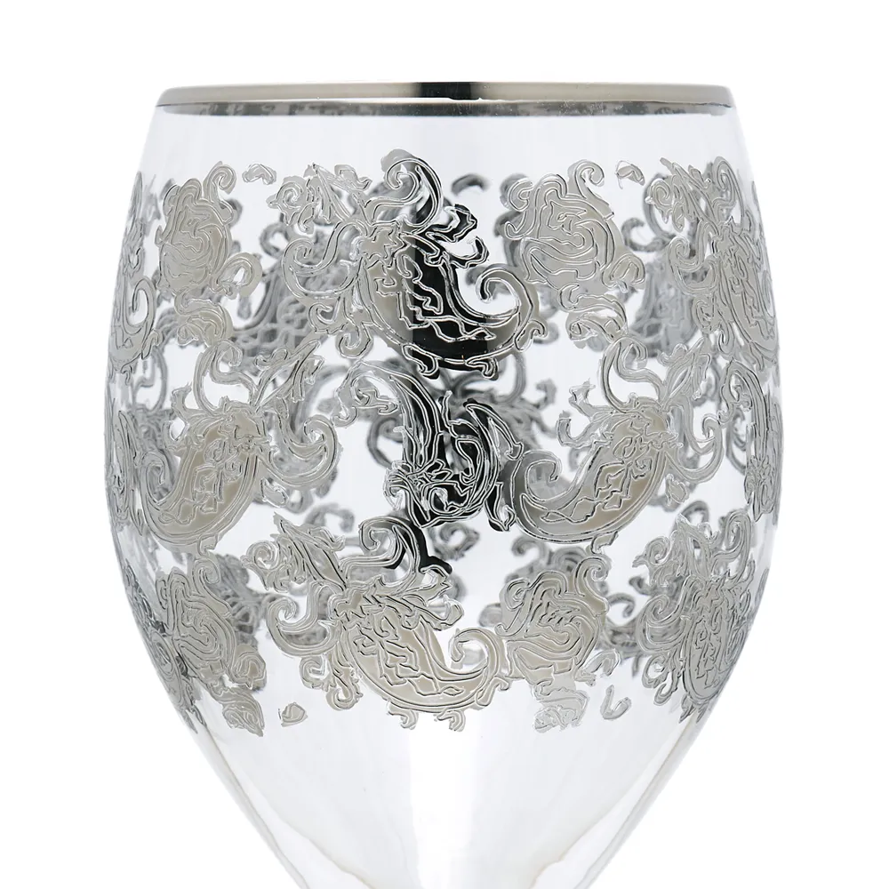 This hand-inlayed Syrah water goblet from ETRO is made with glass colored with “lusters”.  Delicate hand washing only, with no aggressive cleaners.  No rubbing.