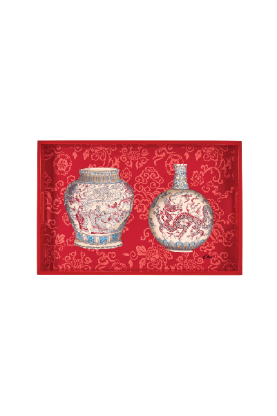 The Tangshan red tray by ETRO HOME takes your decoration to the Chinese. inspired by the Chinese culture representing the most famous and luxurious styles for decorative items and accessories. The elegant design of this Chinese tray makes a timeless and versatile decorative element. Made of wood and finely enameled, it is colorfully hand-decorated with Chinese motifs. This wooden tray features a heraldic decoration with a Chinese dragon style. This Set is unique and is a limited collection of ETRO HOME Accessories that gives your home a high-fashion and luxury makeover. Whether you use it as a trendy Chinese fashion statement accessory or a sartorial serving accessory, it’ll add an elegant ambiance to your home.