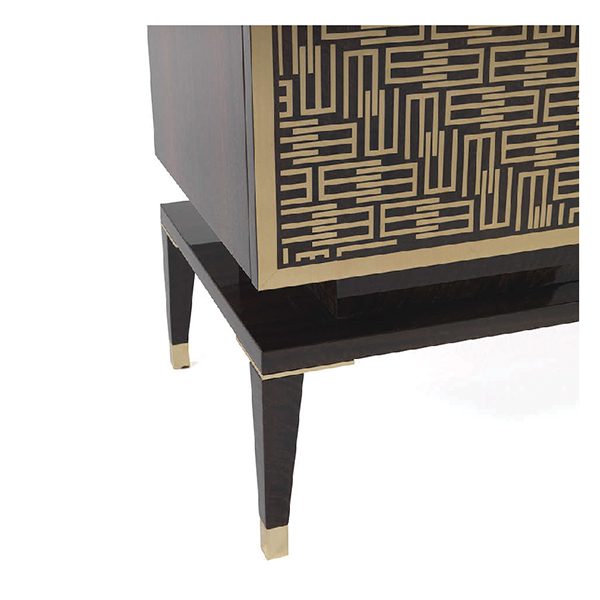 Tibesti is a new, deco style sideboard, characterized by precious inlays in brass with a pattern that incorporates the “E”, initial letter of the ETRO logo. Legs, base, doors and sides are in smoked eucalyptus frisè wood.