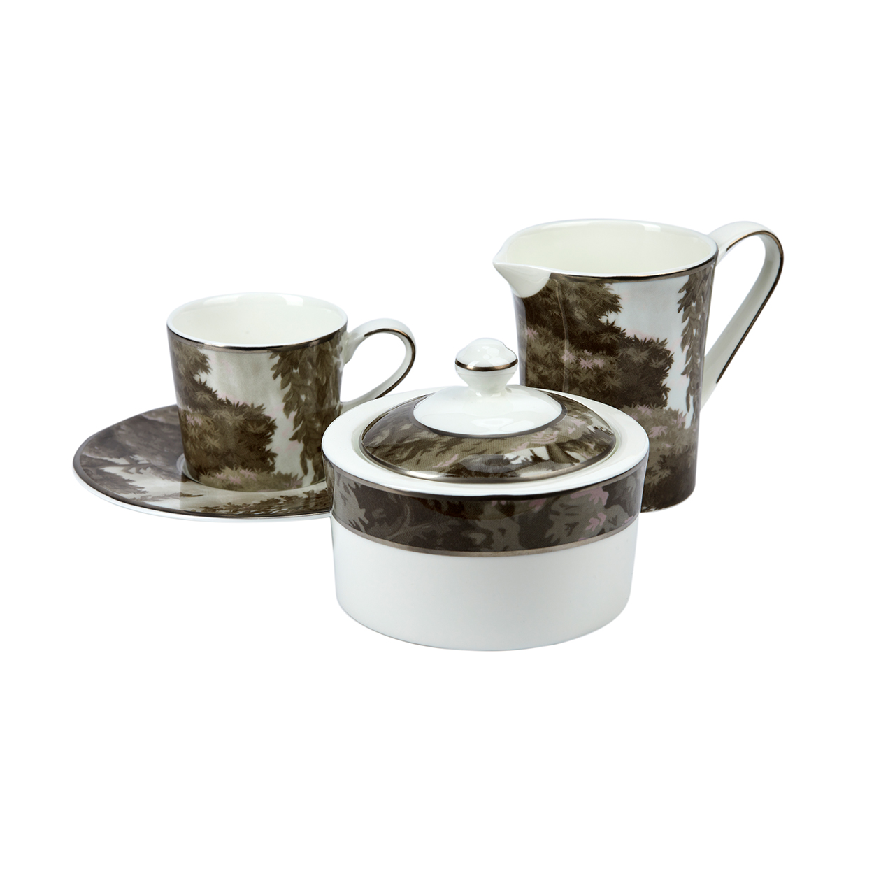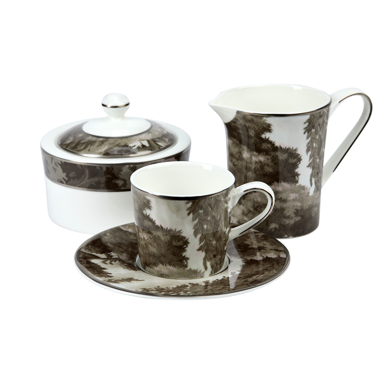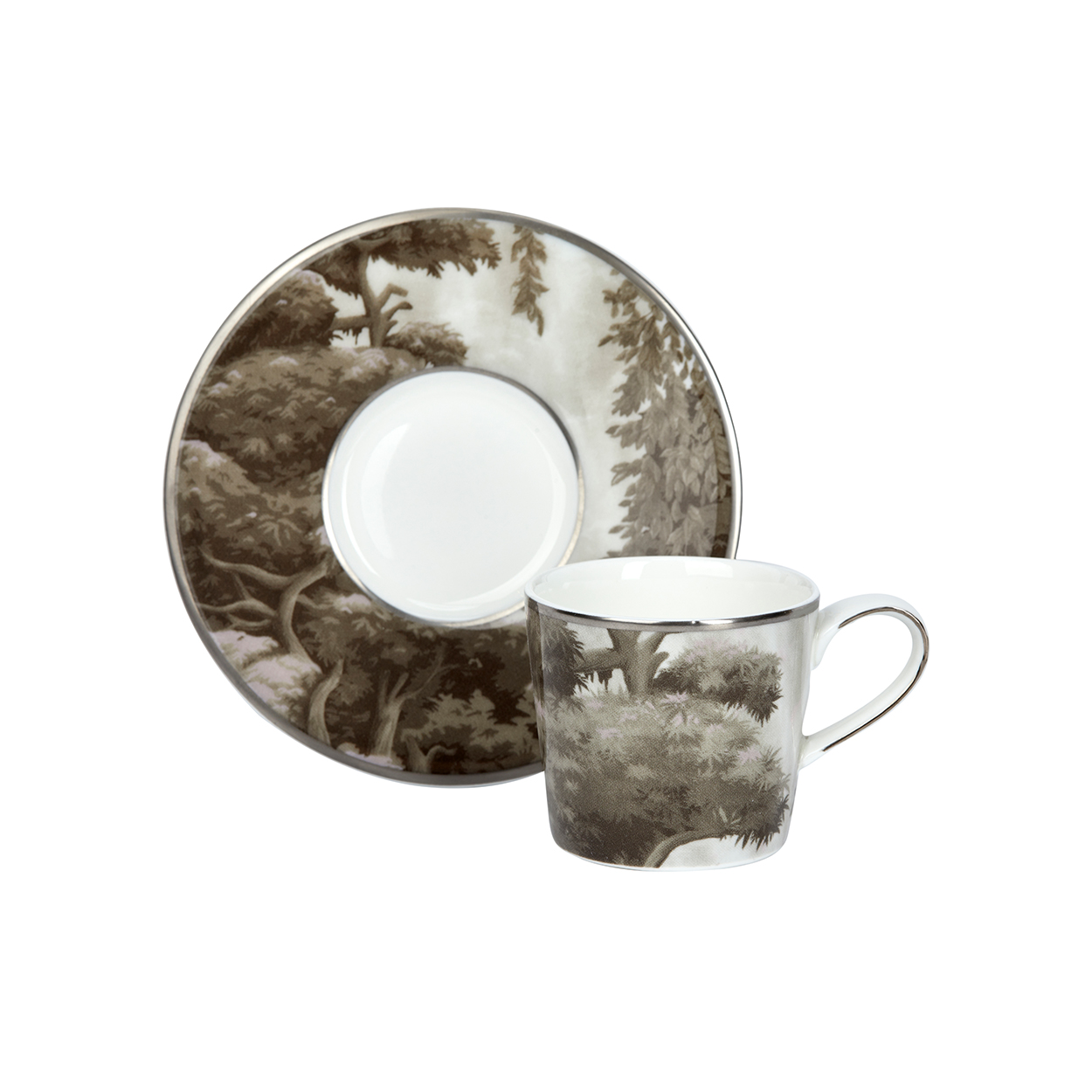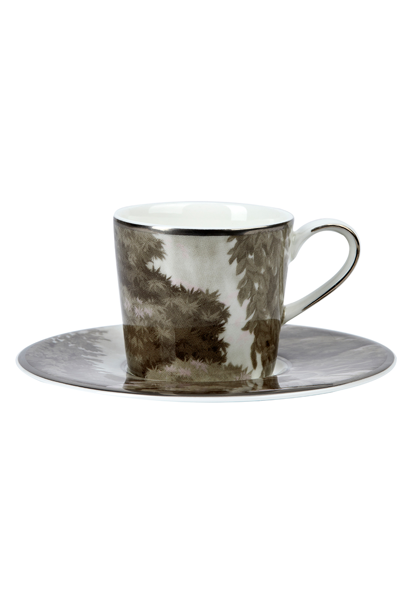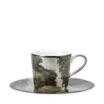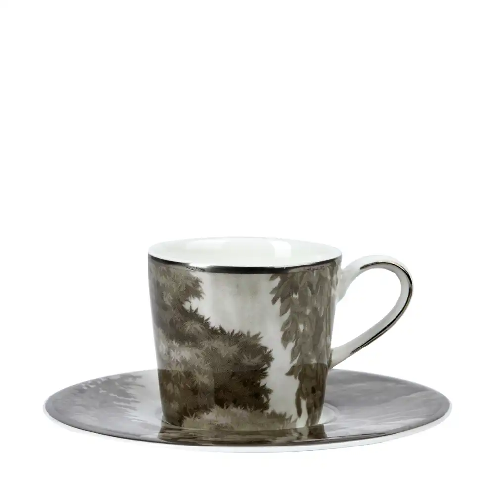 The white garden espresso cup and saucer set exudes quiet sophistication. The intricate botanical design encircling the fine bone China adds a subtle yet striking contrast. This set captures the essence of serene elegance in every detail.