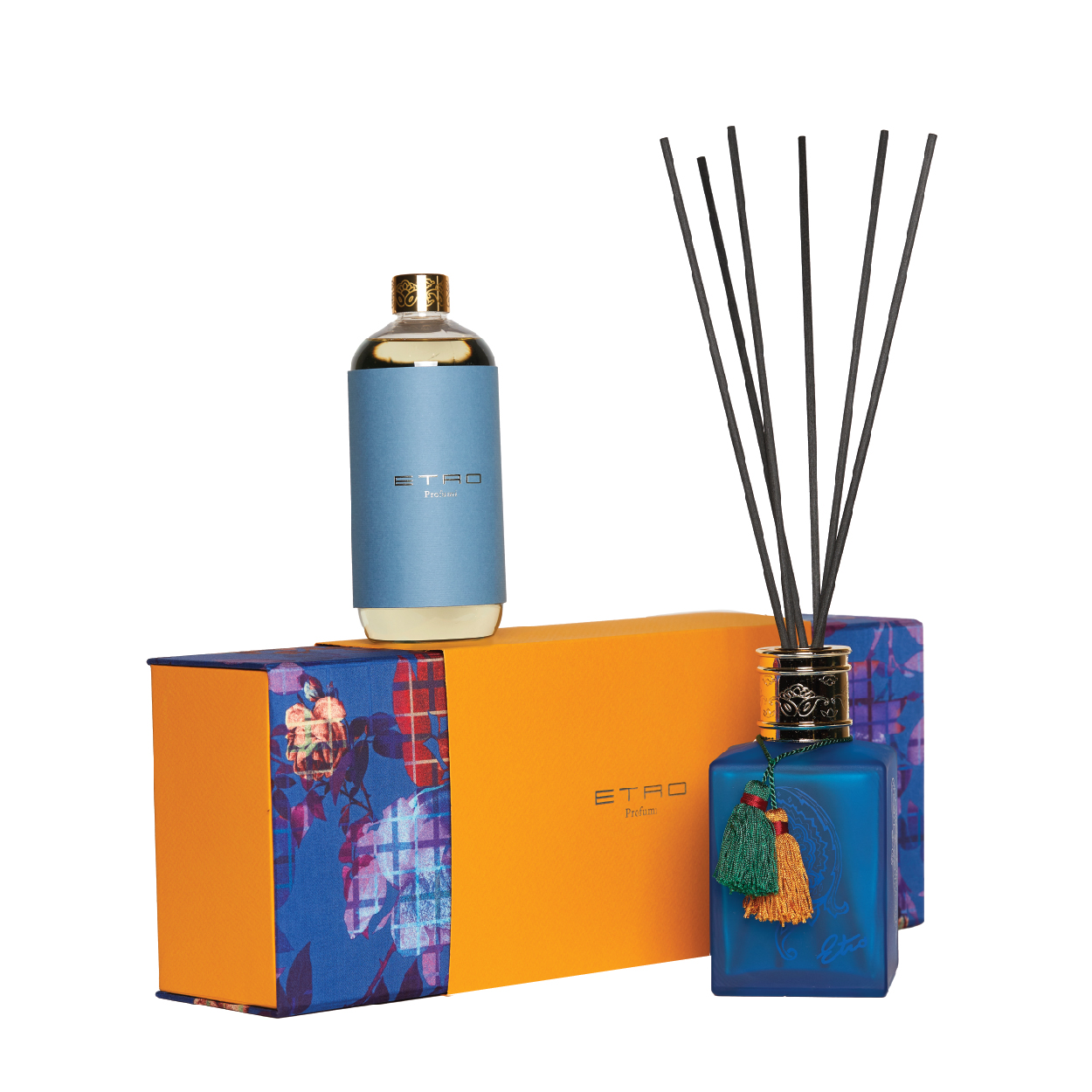 ETRO HOME’S luxurious Zefiro Diffuser comes in colored blue Glass with the signature Paisley symbol, the ancient cashmere design symbol of the ETRO brand, topped with a golden-tone lid all wrapped in a fabric paisley textured Gift Box.